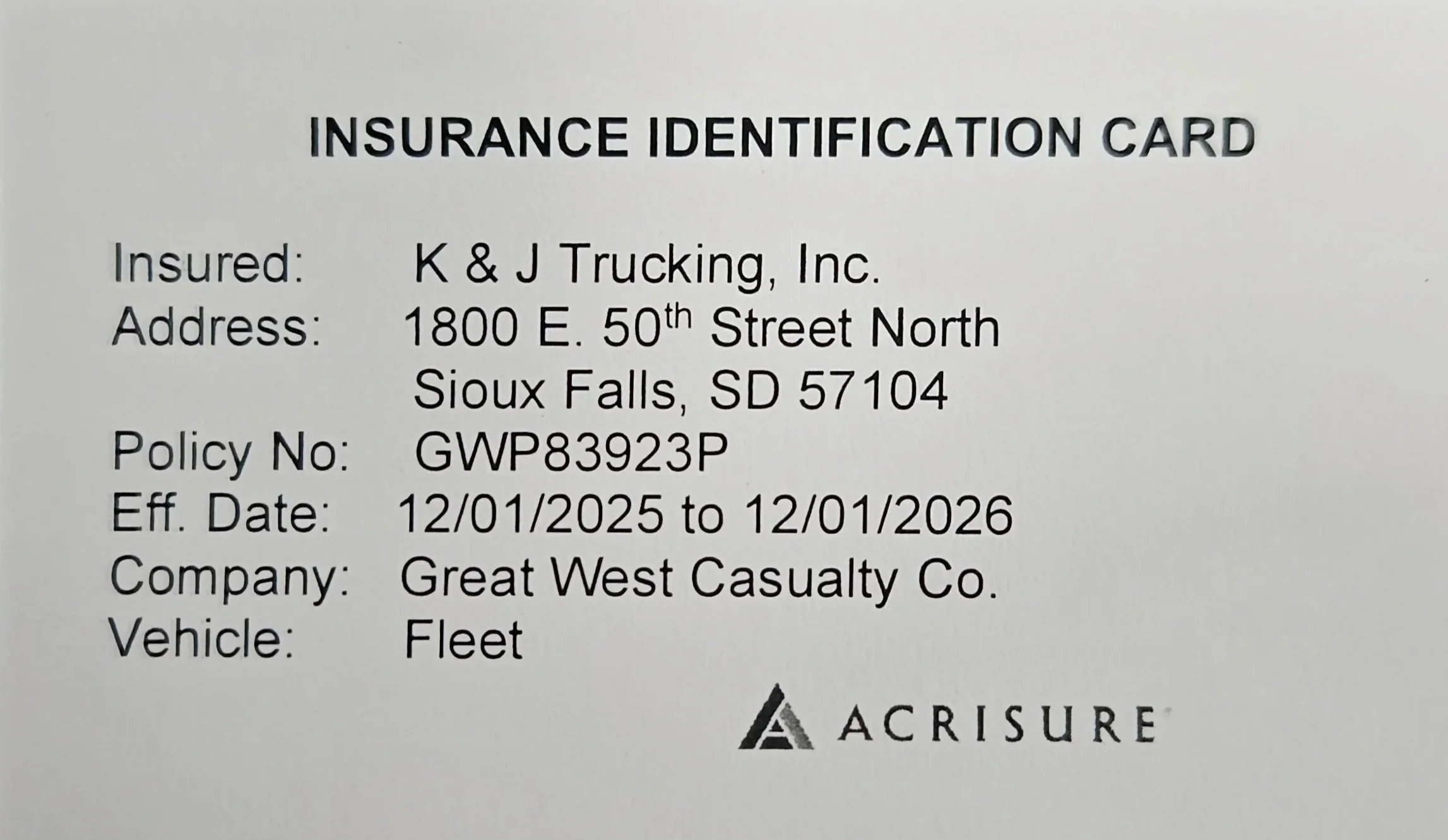 Here is a copy of our insurance card. If you are going into an Air Force Base you will be required to have the physical copy of the card. You have a physical copy in your mailbox. If for some reason you cannot find your physical copy, contact Jennifer.